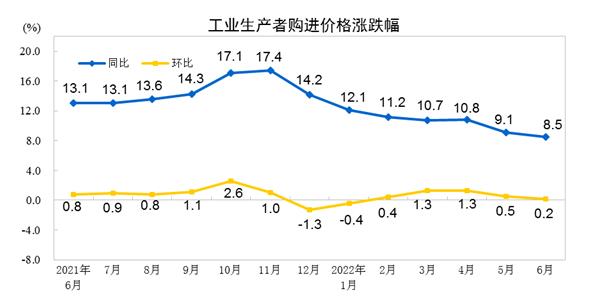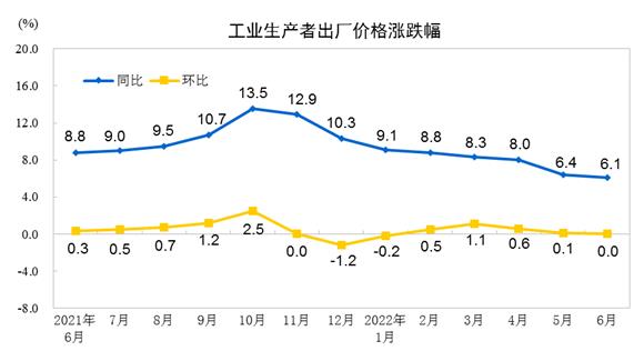 2022年6月份,全国工业生产者出厂价格同比上涨6.1%,环比持平;工业生产者购进价格同比上涨8.5%,环比上涨0.2%。上半年,工业生产者出厂价格比去年同期上涨7.7%,工业生产者购进价格上涨10.4%。