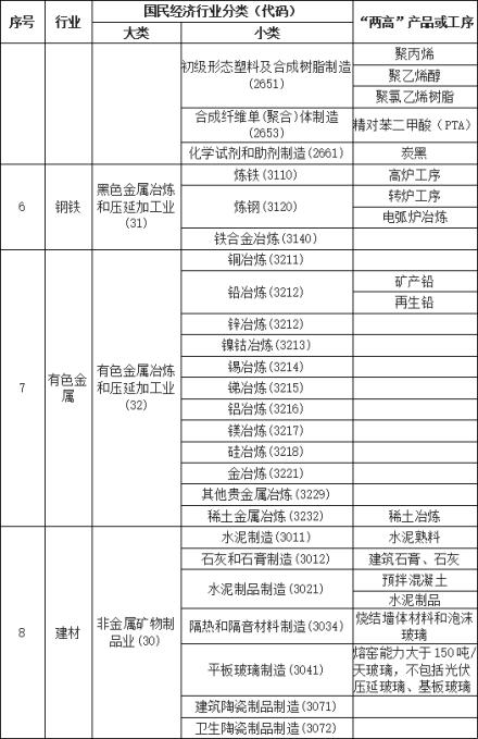 注:1.若上述“两高”产品或工序为空白,则该分类下所有企业纳入“两高”企业管理;若标明产品或工序,则仅涉及该产品或工序的企业纳入“两高”企业管理。企业分类非上述小类,但企业实际生产工序或半成品在上述目录,也应纳入“两高”企业管理。